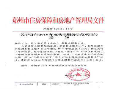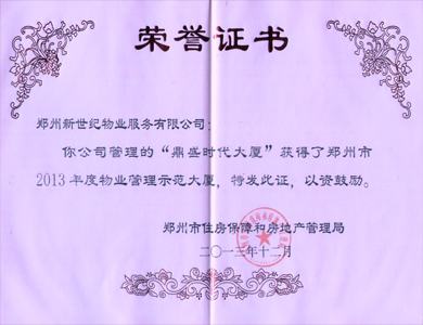 鼎盛时代—郑州市物业管理示范大厦证书