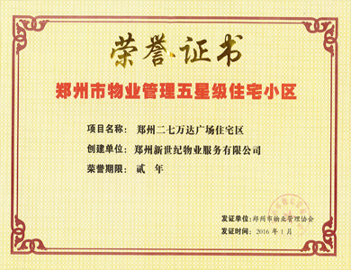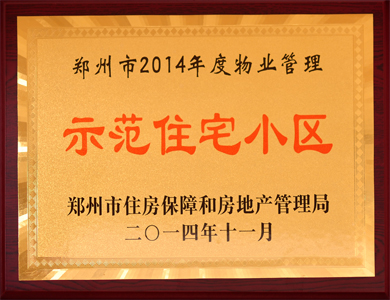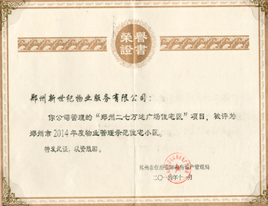 二七万达住宅—郑州市2014年度物业管理示范住宅小区证书